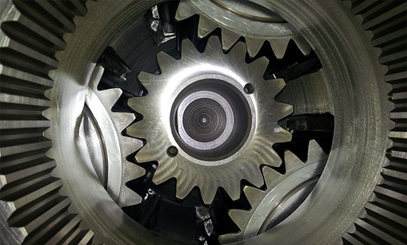 行星減速機(jī)當(dāng)入力側(cè)動力驅(qū)動太陽齒時,可帶動行星齒輪自轉(zhuǎn),并依循著內(nèi)齒環(huán)之軌跡沿著中心公轉(zhuǎn),游星之旋轉(zhuǎn)帶動連結(jié)於托盤之出力軸輸出動力。